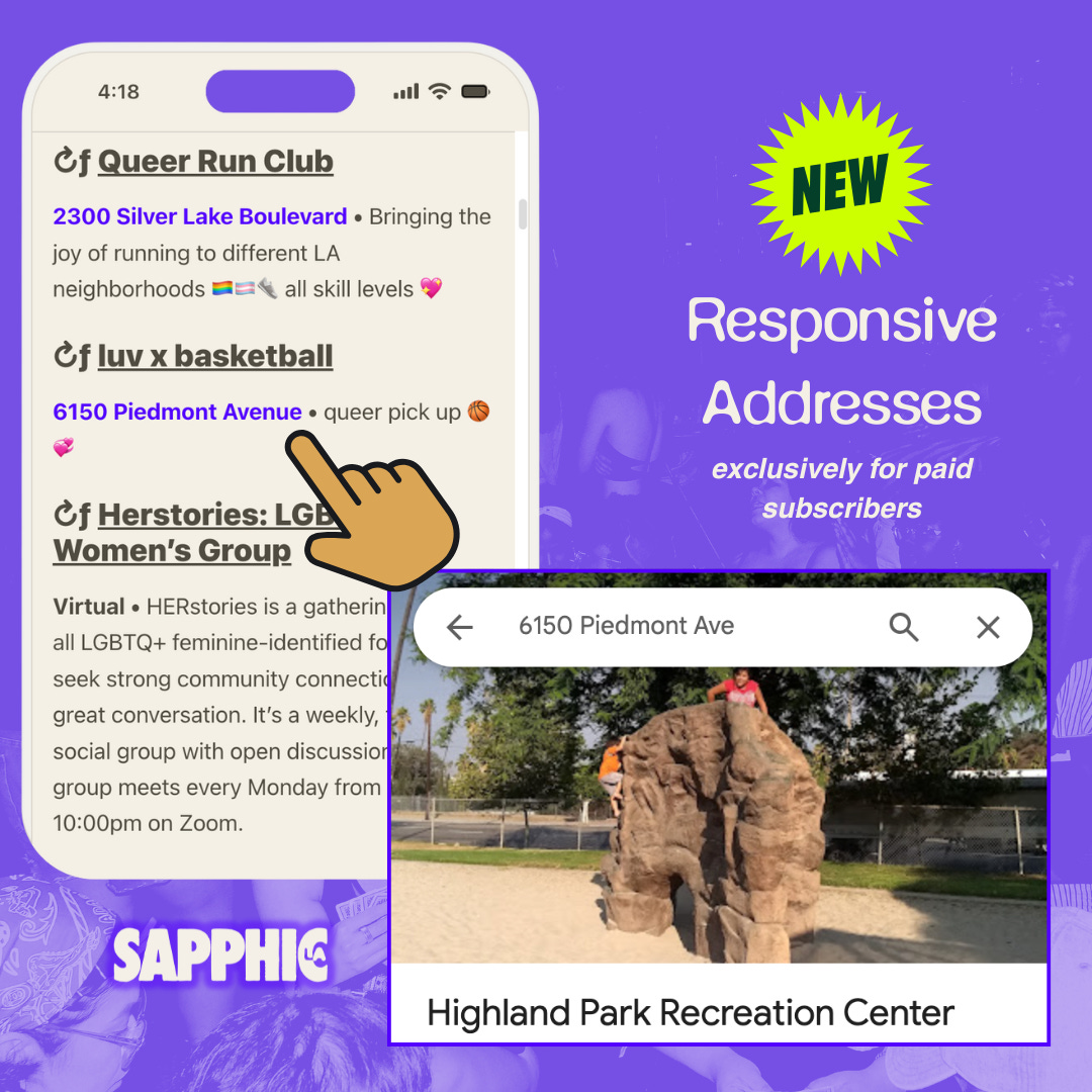 If this newsletter is shortened or clipped in length, click ‘View in Browser’ at the top left of your window to expand it. Please note that many of these events may be subject to cancellation without notice. Make sure to check their pages for the most up-to-date information. Unless otherwise noted, Sapphic LA is not affiliated with any of the events listed.