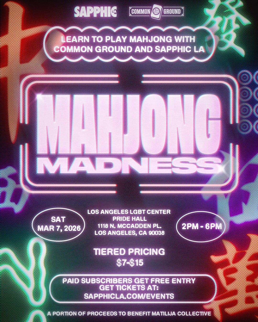 Join us for a chill afternoon of learning and playing Mahjong. We’re taking over the LA LGBT Center's Pride Hall with Common Ground for an afternoon of beginner-friendly gameplay, designed for sapphics and their queer friends to mix and mingle. Paid subs get in for free!
