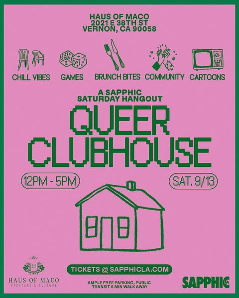 Also…are you coming to Queer Clubhouse on September 13th? We’d love to see your sexy sapphic face. It’s very much not nightclub vibes and more kickback vibes. We are almost sold out and we aren’t selling tickets at the door, so get your ticket now!